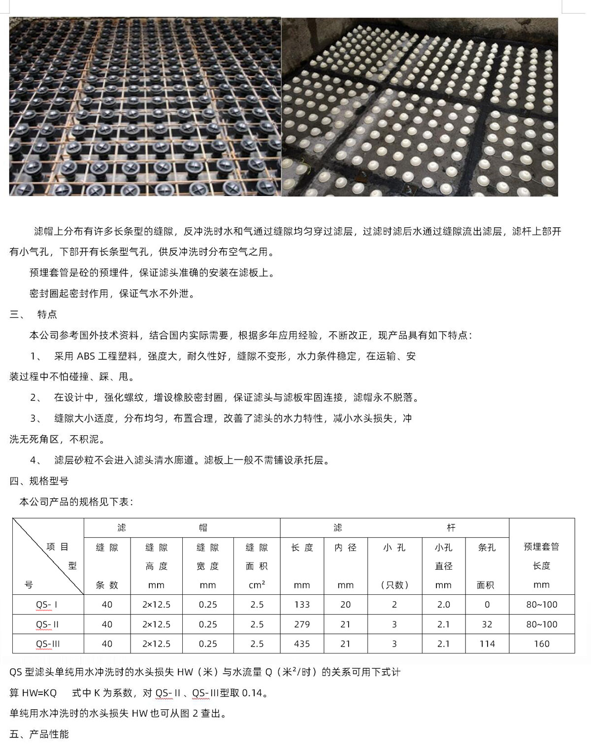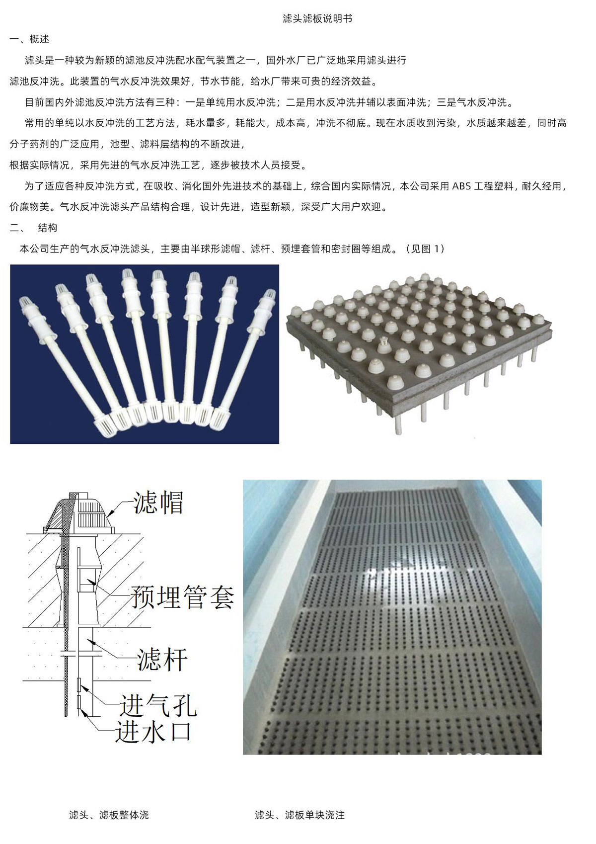 濾頭采用ABS工程塑料制造,由濾帽、濾帽座、濾桿、預(yù)埋管套、密封圈等五部分組成,濾頭分為長柄和短柄慮頭兩種、濾板采用鋼筋混凝土或ABS濾板制造為配合應(yīng)用。